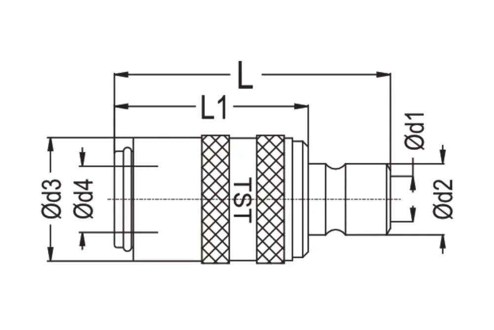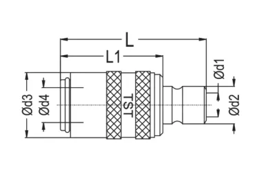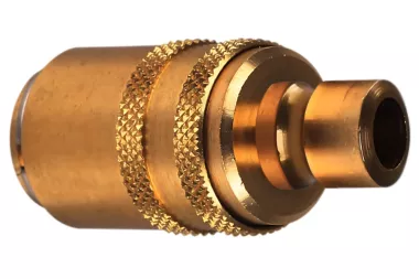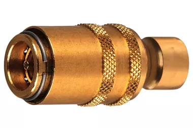 Adaptor szybkozłącza, gniazdo DN 9 europejskie seria TST 090 - wtyk DN 9 amerykański seria TST 9, z zaworem. Stosowane szeroko w przemyśle do chłodzenia form wtryskowych i odlewniczych części z tworzyw sztucznych, aluminium, mosiądzu i stopów cynku. Może być stosowane do wody w maszynach czyszczących, do gorącego oleju, pary wodnej. Seria: TST 090. Ciśnienie robocze: 25 bar. Materiał: mosiądz (korpus gniazda, przyłącze, tuleja, zawór), stal nierdzewna (sprężyna, pierścień, kulki). Temperatura pracy: od -20°C do +200°C (viton).