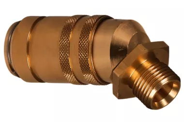 Gniazdo 45° DN13 szybkozłącza z gwintem zewnętrznym metrycznym (uszczelnienie stożek 60°), bez zaworu. Stosowane szeroko w przemyśle do chłodzenia form wtryskowych i odlewniczych części z tworzyw sztucznych, aluminium, mosiądzu i stopów cynku. Może być stosowane do wody w maszynach czyszczących, do gorącego oleju, pary wodnej. Seria: TST 190. Ciśnienie robocze: 25 bar. Materiał: mosiądz (korpus gniazda, przyłącze, tuleja), stal nierdzewna (sprężyna, pierścień, kulki). Temperatura pracy: od -20°C do +200°C (viton).