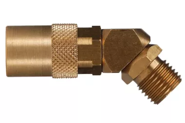 Gniazdo 45° DN 6 szybkozłącza z gwintem zewnętrznym BSP, z zaworem. Stosowany szeroko w przemyśle do chłodzenia form wtryskowych i odlewniczych części z tworzyw sztucznych, aluminium, mosiądzu i stopów cynku. Może być stosowane do wody w maszynach czyszczących, do gorącego oleju, pary wodnej. Seria: TST 6. Ciśnienie robocze: 10 bar. Materiał: mosiądz (korpus gniazda, przyłącze, tuleja, zawór), stal nierdzewna (sprężyna, pierścień, kulki). Temperatura pracy: od -20°C do +200°C (viton).