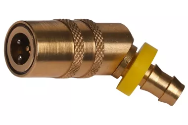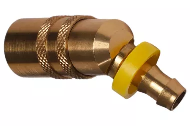 Gniazdo 45° DN 6 szybkozłącza z końcówką do węża PUSH-ON, z zaworem, stosowane szeroko w przemyśle do chłodzenia form wtryskowych i odlewniczych części z tworzyw sztucznych, aluminium, mosiądzu i stopów cynku. Może być stosowane do wody w maszynach czyszczących, do gorącego oleju, pary wodnej. Seria: TST 060. Ciśnienie robocze: 25 bar. Materiał: mosiądz (korpus gniazda, przyłącze, tuleja, zawór), stal nierdzewna (sprężyna, pierścień, kulki). Temperatura pracy: od -20°C do +200°C (viton).