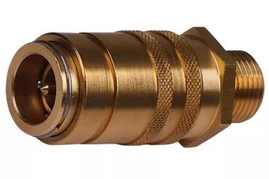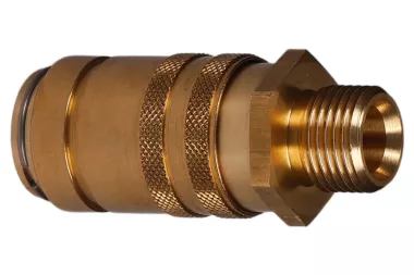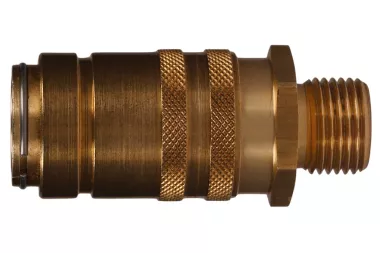 Gniazdo DN13 szybkozłącza z gwintem zewnętrznym BSP, z zaworem. Stosowane szeroko w przemyśle do chłodzenia form wtryskowych i odlewniczych części z tworzyw sztucznych, aluminium, mosiądzu i stopów cynku. Może być stosowane do wody w maszynach czyszczących, do gorącego oleju, pary wodnej. Seria: TST 190. Ciśnienie robocze: 25 bar. Materiał: mosiądz (korpus gniazda, przyłącze, tuleja, zawór), stal nierdzewna (sprężyna, pierścień, kulki). Temperatura pracy: od -20°C do +200°C (viton).