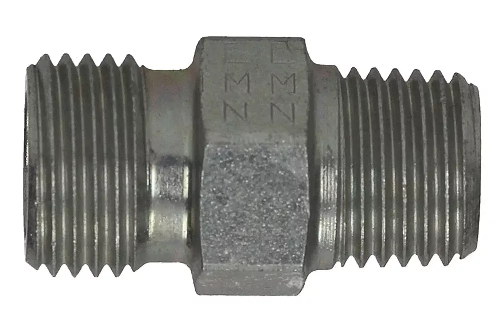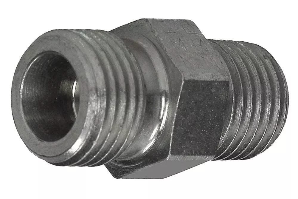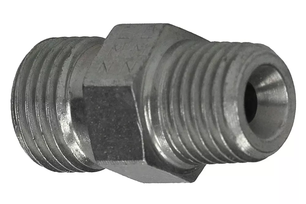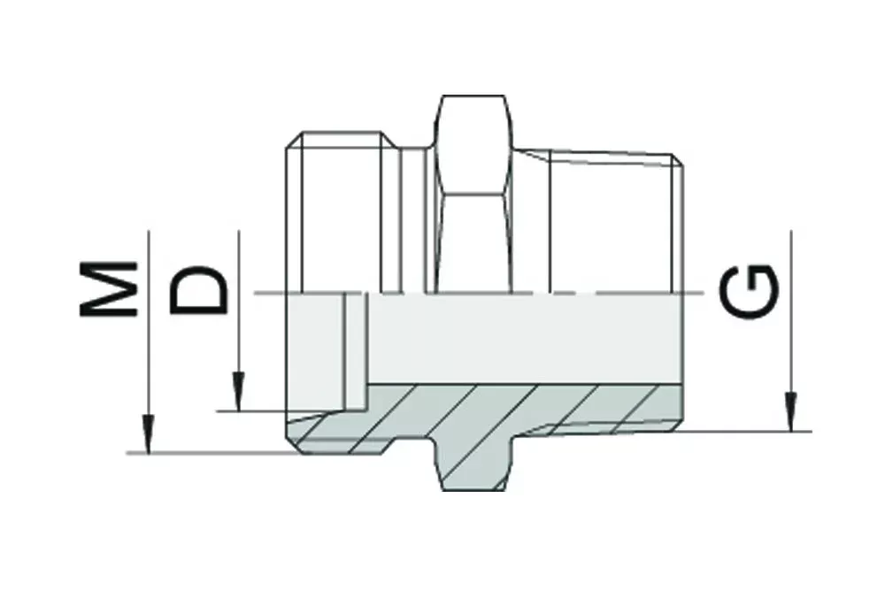 Przyłączka DIN 2353 wkrętna: gniazdo 24° DIN 2353 z gwintem zewnętrznym metrycznym / gwint zewnętrzny metryczny stożkowy (uszczelnienie na gwincie). Materiał: stal węglowa, ocynkowana. Opis