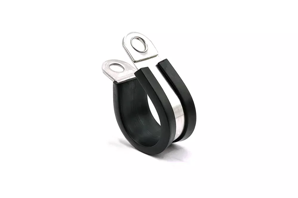 Obejma RUBBER P-CLIP zgodna z normą DIN 3016 polecana do bezpiecznego i tłumiącego drgania montażu rur, węży, wiązek kabli, karbowanych rur elektroinstalacyjnych (osłony na kable) itp., dla których istnieje możliwość otarcia i uszkodzenia. Obejma tego typu znajduje szerokie zastosowanie, m.in.: maszyny rolnicze i budowlane, budowa silników spalinowych, przemysł kolejowy, sprzęt elektryczny, sprzęt AGD itp. Wykonana jest z jednego odcinka wygiętej taśmy stalowej oraz gumowego kołnierza. Otwory na obu końcach taśmy są wzmocnione stalowymi płytkami, co zapewnia wytrzymałość na docisk przy dużych obciążeniach mechanicznych. Taśma wykonana ze stali nierdzewnej AISI 304 (W4), profil z gumy EPDM odpornej na wodę, ścieranie, zmiany temperatur i starzenie. Wersja W4 zalecana do zastosowań w przemyśle morskim. Obejma nie zawiera śruby, podkładki i nakrętki. Materiał: stal AISI 304 (taśma), guma EPDM (kołnierz). Szerokość taśmy: 12 mm, 15 mm, 20 mm lub 25 mm.