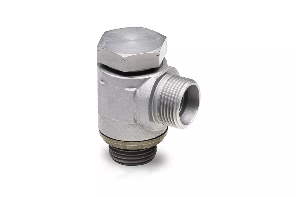 Przyłączka DIN 2353 Eaton Walterscheid™ wkrętna kątowa nastawialna BANJO, typ WH-ME: gniazdo 24° DIN 2353 z gwintem zewnętrznym metrycznym oraz z gwintem zewnętrznym metrycznym (uszczelnienie DIN 3852 typ E – uszczelka elastomerowa o przekroju prostokątnym). Współczynnik bezpieczeństwa 4:1. Występuje jako: LL (seria bardzo lekka), L (seria lekka), S (seria ciężka). Materiał: stal węglowa, z powłoką galwaniczną Guardian Seal™.